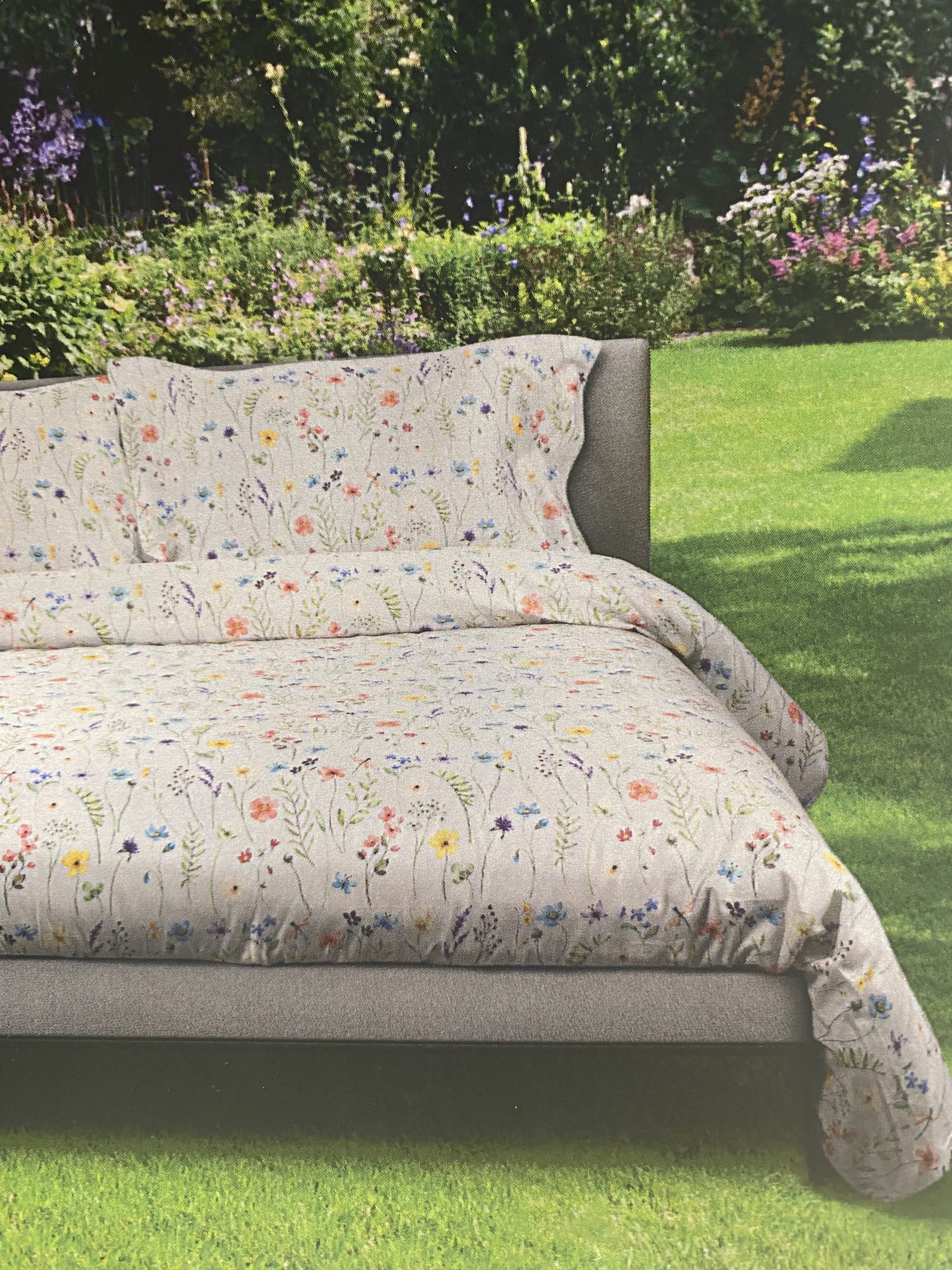 Completo copripiumino Camille in splendida stampa digitale su prezioso raso di puro Cotone, girando la balza si scopre la stampa a vista con effetto copriletto